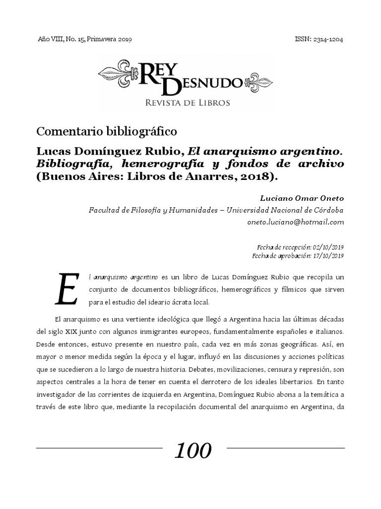 - 1a ed. Resumen de El anarquismo argentino en los aos veinte. Bibliografa hemerografa y fondos de archivo Lucas Domnguez Rubio.